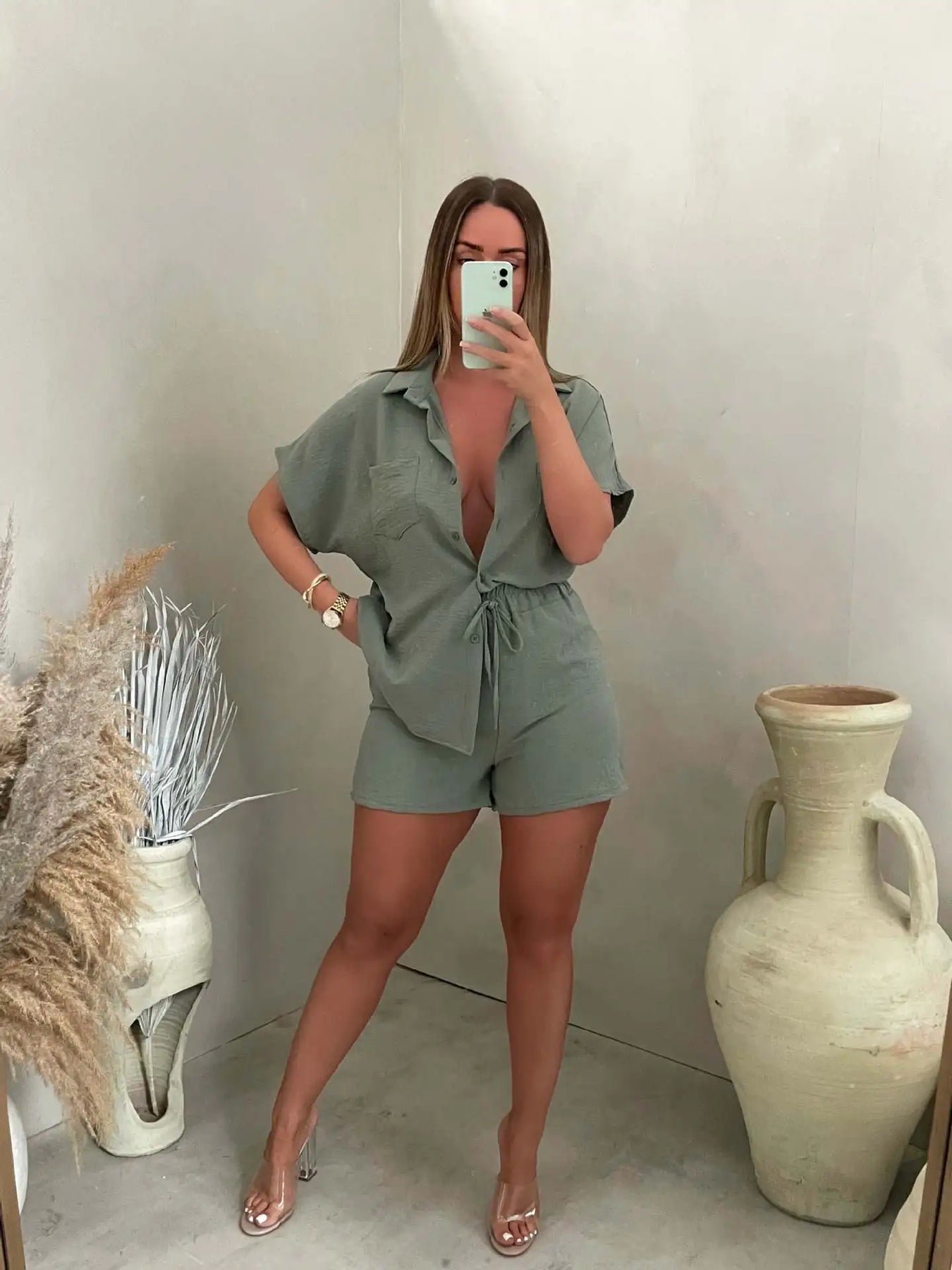 Two-piece summer set: loose-fit blouse & high-waisted shorts
